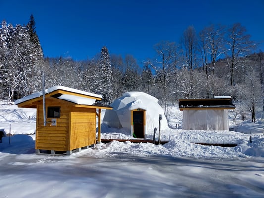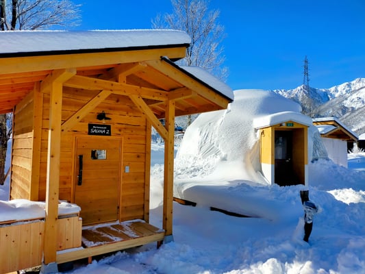 当施設で人気のグランピング施設が2024年、雪でもお過ごしいただけるドームテントにリニューアル。そしてプライベートのサウナ小屋、水風呂、バーベキュー小屋が各ドームテントに隣接♪
