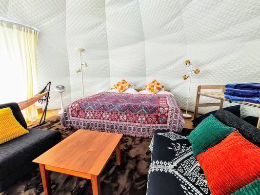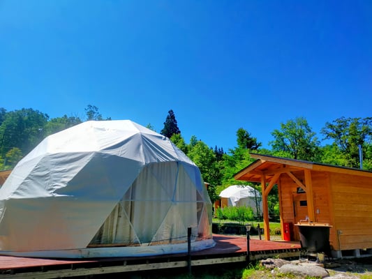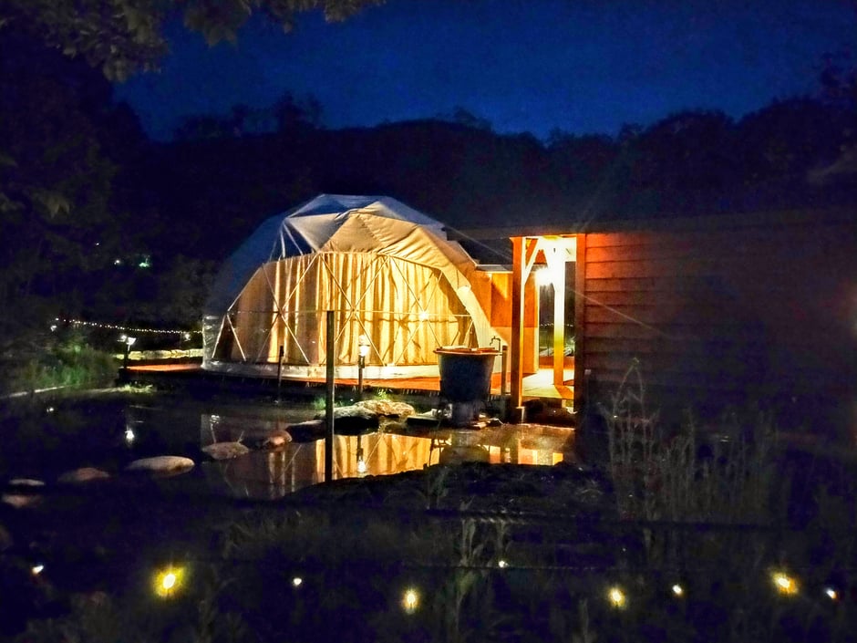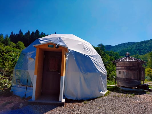 プライベートサウナ&水風呂&屋外でくつろげる専用の東屋付きのグランピングドームテントです。