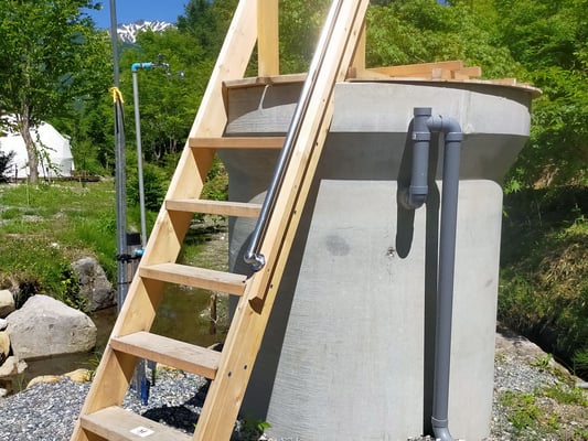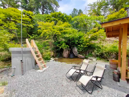 沢から引いている冷たい天然水の滝落としのある小さな池が近くにございます。自然の中で北アルプスの山々を眺めながらバーベキューやプライベートサウナをお楽しみいただけるグランピングプランです。
